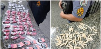 Durante uma ação da PM na Rua Pastor Joadir, Horto Florestal, PMs apreenderam uma sacola contendo 54 pinos e 10 sacolés de cocaína, além...