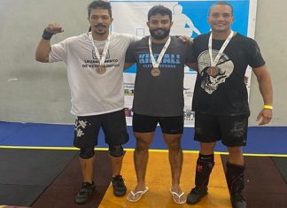 O atleta da Associação Esportiva Cultural Regional (AECR), Alessander Barroso Alves, de 33 anos, comemora a 2ª colocação em sua categoria M2 (até 81...